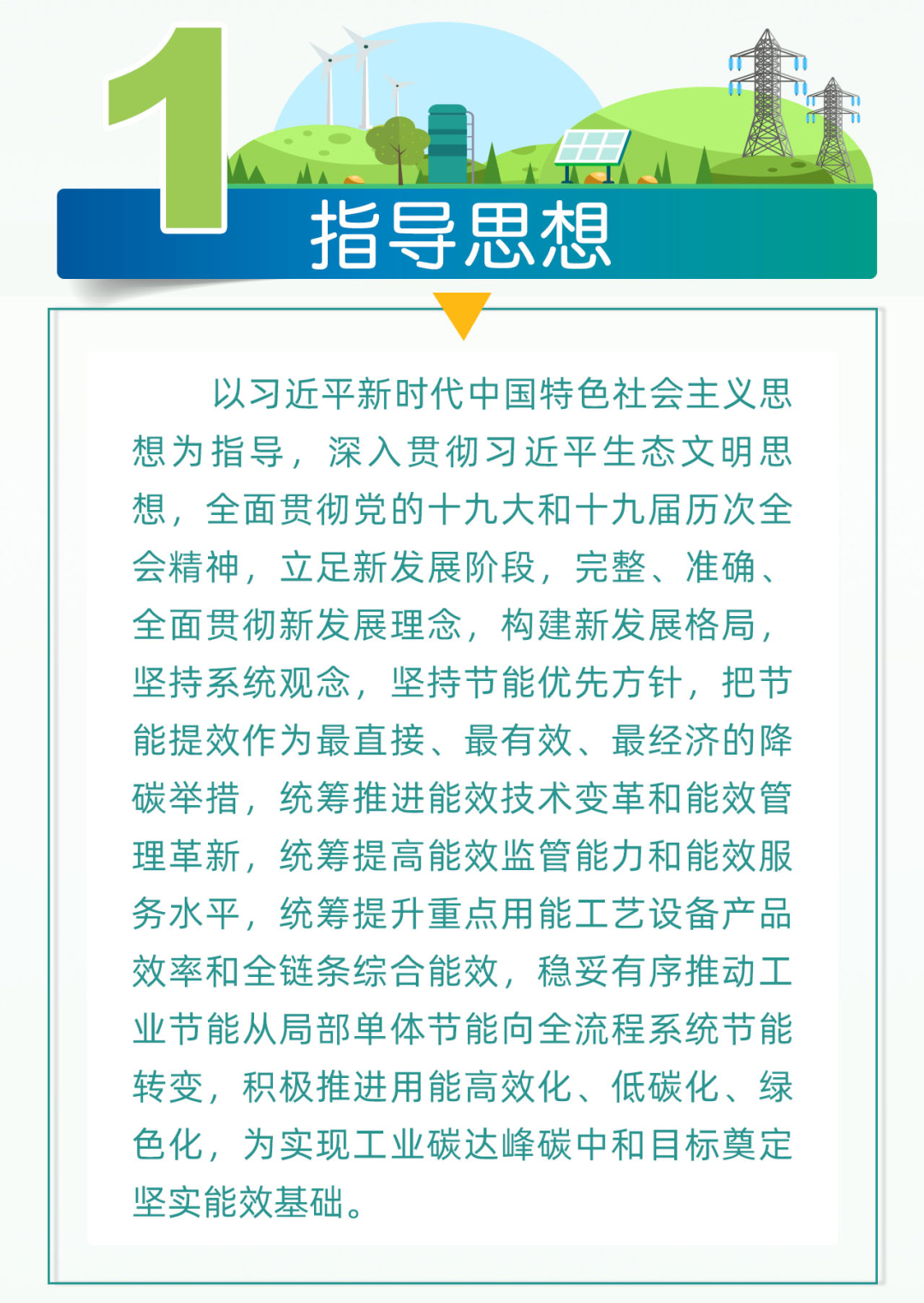指导思想是以习近平新时代中国特色社会主义思想为指导,深入贯彻习近平生态文明思想,全面贯彻党的十九大和十九届历次全会精神,立足新发展阶段,完整、准确、全面贯彻新发展理念,构建新发展格局,坚持系统观念,坚持节能优先方针,把节能提效作为最直接、最有效、最经济的降碳举措,统筹推进能效技术变革和能效管理革新,统筹提高能效监管能力和能效服务水平,统筹提升重点用能工艺设备产品效率和全链条综合能效,稳妥有序推动工业节能从局部单体节能向全流程系统节能转变,积极推进用能高效化、低碳化、绿色化,为实现工业碳达峰碳中和目标奠定坚实能效基础。
