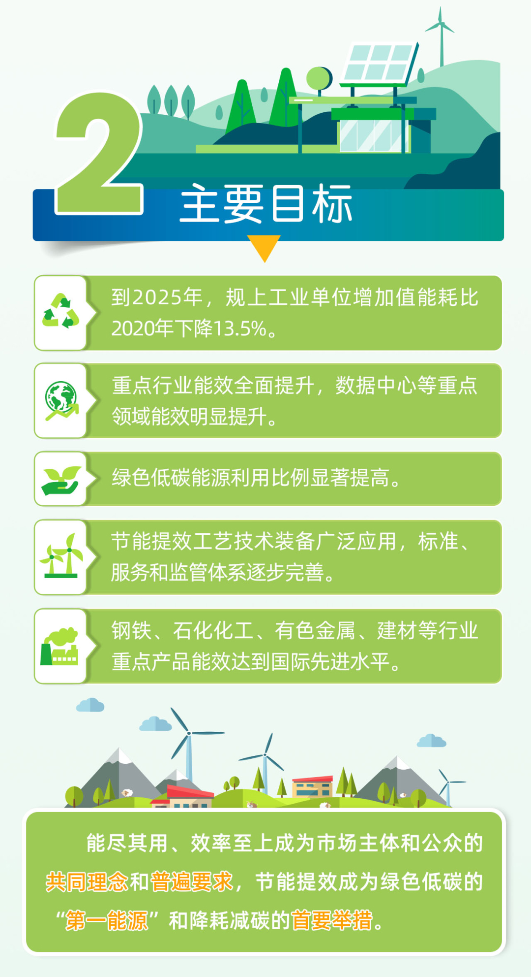 主要目标是到2025年,重点工业行业能效全面提升,数据中心等重点领域能效明显提升,绿色低碳能源利用比例显著提高,节能提效工艺技术装备广泛应用,标准、服务和监管体系逐步完善,钢铁、石化化工、有色金属、建材等行业重点产品能效达到国际先进水平,规模以上工业单位增加值能耗比2020年下降13.5%。能尽其用、效率至上成为市场主体和公众的共同理念和普遍要求,节能提效进一步成为绿色低碳的“第一能源”和降耗减碳的首要举措。同时,结合产业发展实际提出一系列具体目标,到2025年,新增高效节能电机占比达到70%以上,新增高效节能变压器占比达到80%以上,新建大型、超大型数据中心电能利用效率(pue)优于1.3,工业领域电能占终端能源消费比重达到30%。