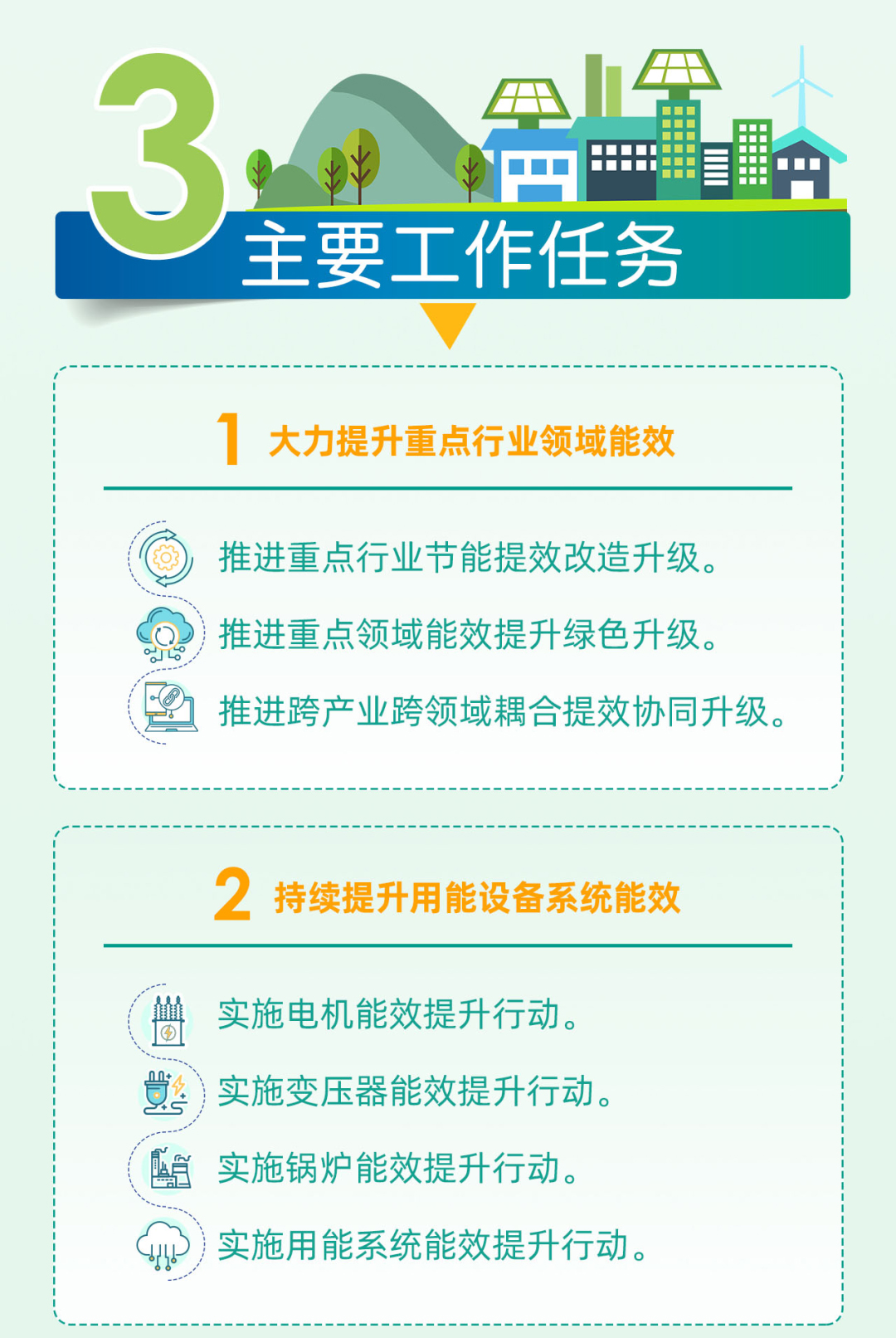 一是大力提升重点行业领域能效。加强重点行业能量系统优化、余热余压利用、可再生能源利用、公辅设施改造等。持续开展国家绿色数据中心建设,提高网络设备等信息处理设备能效。推进跨产业跨领域耦合提效协同升级。