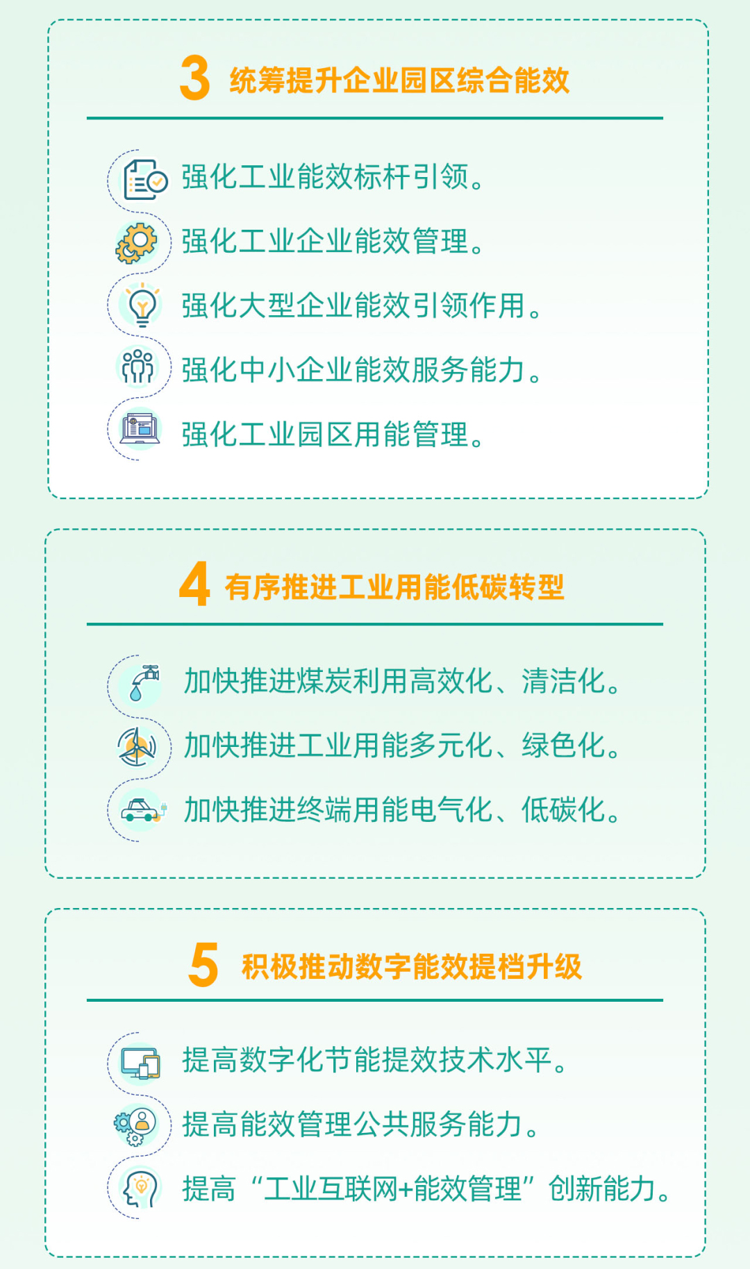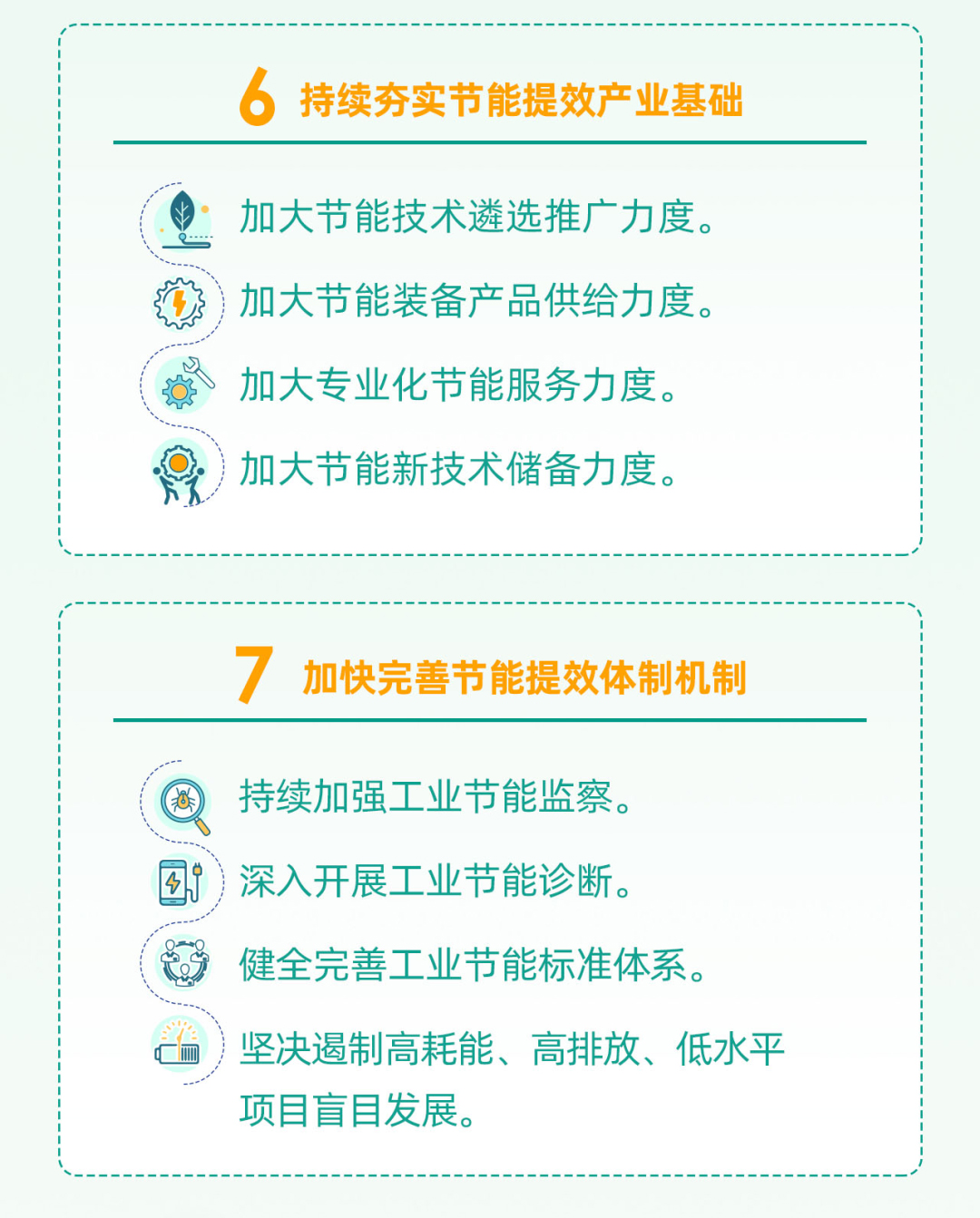 七是加快完善节能提效体制机制。健全完善工业节能有关政策、法规、标准,强化节能监督管理和诊断服务,夯实工业能效提升基础。